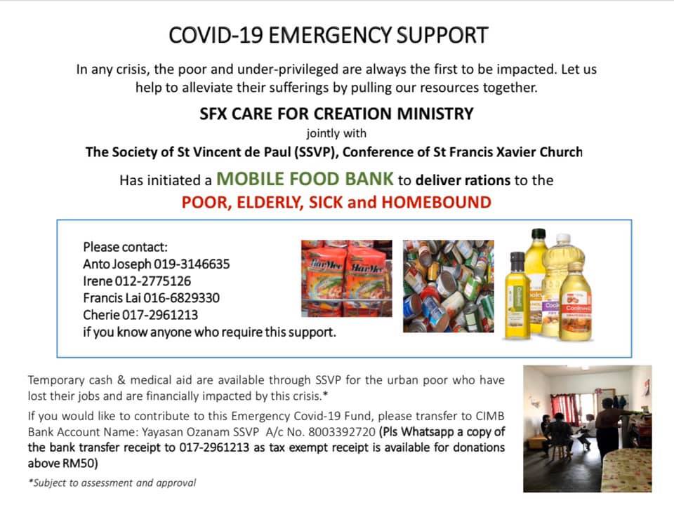 We wanted to establish a Food Bank in the church early this year but the project was shelved with the closure of the church premises under the movement control order by the government. The prolonged pandemic resulted in the hardship of the people as more businesses failed and employment rates continue to escalate. As usual Malaysians under the B40 group are the worst hit. We decided to proceed with the food bank on a mobile basis with storage outside the church premises. SFX Mobile Food Bank, a joint project between SSVP and Care for Creation Ministry (C4C) was officially launched to the BECs on 26th November 2020 with our staging centre in SS2. The first collection from the BECs was on 5th December 2020. Rice, cooking oil, milk powder, milo, instant noodles, biscuits, sardines, canned curry chicken, dhall, sugar and salt were generously donated.